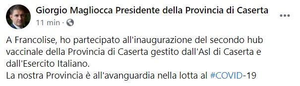 "A Francolise, ho partecipato all'inaugurazione del secondo hub vaccinale della Provincia di Caserta gestito dall'Asl di Caserta e dall'Esercito Italiano. La nostra Provincia- si legge nella nota- è all'avanguardia nella lotta al #COVID-19"