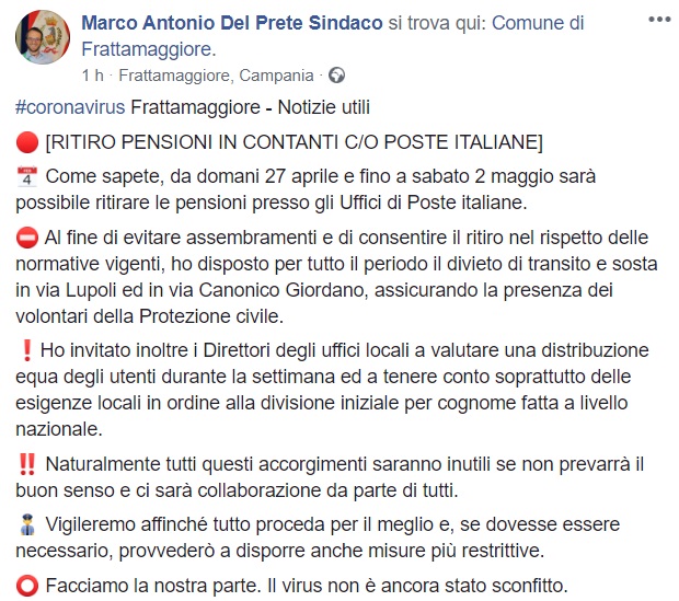 Questo quanto apprendiamo dalla pagina facebook del Sindaco De Prete: