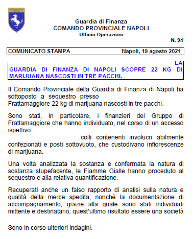 "(...) LA GUARDIA DI FINANZA DI NAPOLI SCOPRE 22 KG DI MARIJUANA NASCOSTI IN TRE PACCHI.