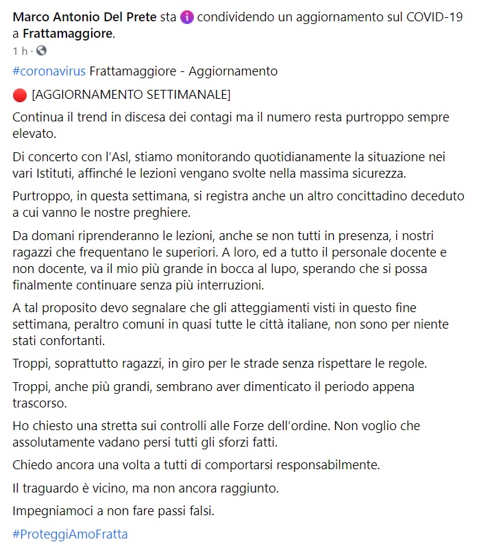 "Continua il trend in discesa dei contagi ma il numero resta purtroppo sempre elevato. Di concerto con l’Asl, stiamo monitorando quotidianamente la situazione nei vari Istituti, affinché le lezioni vengano svolte nella massima sicurezza. -Si legge nella nota- Purtroppo, in questa settimana, si registra anche un altro concittadino deceduto a cui vanno le nostre preghiere. Da domani riprenderanno le lezioni, anche se non tutti in presenza, i nostri ragazzi che frequentano le superiori. A loro, ed a tutto il personale docente e non docente, va il mio più grande in bocca al lupo, sperando che si possa finalmente continuare senza più interruzioni. A tal proposito devo segnalare che gli atteggiamenti visti in questo fine settimana, peraltro comuni in quasi tutte le città italiane, non sono per niente stati confortanti. Troppi, soprattutto ragazzi, in giro per le strade senza rispettare le regole. -Si legge nella nota- Troppi, anche più grandi, sembrano aver dimenticato il periodo appena trascorso. Ho chiesto una stretta sui controlli alle Forze dell’ordine. Non voglio che assolutamente vadano persi tutti gli sforzi fatti. Chiedo ancora una volta a tutti di comportarsi responsabilmente. Il traguardo è vicino, ma non ancora raggiunto. Impegniamoci a non fare passi falsi. ProteggiAmoFratta"