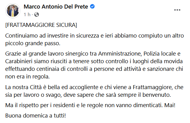 Questo il post pubblicato sulla pagina Facebook del sindaco di Frattamaggiore, Marco Antonio Del Prete: "Continuiamo ad investire in sicurezza e ieri abbiamo compiuto un altro piccolo grande passo. Grazie al grande lavoro sinergico tra Amministrazione, Polizia locale e Carabinieri siamo riusciti a tenere sotto controllo i luoghi della movida effettuando centinaia di controlli a persone ed attività e sanzionare chi non era in regola. La nostra Città è bella ed accogliente - si legge nel post - e chi viene a Frattamaggiore, che sia per lavoro o svago, deve sapere che sarà sempre il benvenuto. Ma il rispetto per i residenti e le regole non vanno dimenticati. Mai! Buona domenica a tutti - conclude".