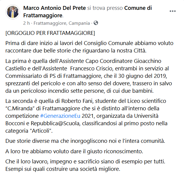 Questo il contenuto del post pubblicato sulla pagina facebook del sindaco di Frattamaggiore, Marco Antonio Del Prete. "[ORGOGLIO PER FRATTAMAGGIORE] Prima di dare inizio ai lavori del Consiglio Comunale abbiamo voluto raccontare due belle storie che riguardano la nostra Città. La prima è quella dell’Assistente Capo Coordinatore Gioacchino Castiello e dell’Assistente Francesco Criscio, entrambi in servizio al Commissariato di PS di Frattamaggiore, che il 30 giugno del 2019, sprezzanti del pericolo e con alto senso del dovere, trassero in salvo da un pericoloso incendio sette persone, di cui due bambini. La seconda - prosegue il post - è quella di Roberto Fani, studente del Liceo scientifico “C.Miranda” di Frattamaggiore che si è distinto all’interno della competizione GenerazioneEU2021, organizzata da Università Bocconi e Repubblica@Scuola, classificandosi al primo posto nella categoria “Articoli”. Due storie diverse - continua - ma che inorgogliscono noi e l’intera comunità. A loro tre abbiamo voluto dare il giusto riconoscimento. Che il loro lavoro, impegno e sacrificio siano di esempio per tutti. Esempi - conclude il post - sui quali costruire una società migliore".