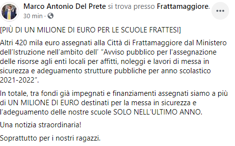 Questo il post pubblicato sulla sua pagina Facebook dal Sindaco di Frattamaggiore Marco Antonio Del Prete: "PIÙ DI UN MILIONE DI EURO PER LE SCUOLE FRATTESI. Altri 420 mila euro assegnati alla Città di Frattamaggiore dal Ministero dell’Istruzione nell’ambito dell’ “Avviso pubblico per l'assegnazione delle risorse agli enti locali per affitti - si legge nel post - noleggi e lavori di messa in sicurezza e adeguamento strutture pubbliche per anno scolastico 2021-2022”. In totale, tra fondi già impegnati e finanziamenti assegnati siamo a più di UN MILIONE DI EURO destinati - prosegue il post - per la messa in sicurezza e l’adeguamento delle nostre scuole SOLO NELL’ULTIMO ANNO. Una notizia straordinaria! Soprattutto per i nostri ragazzi".
