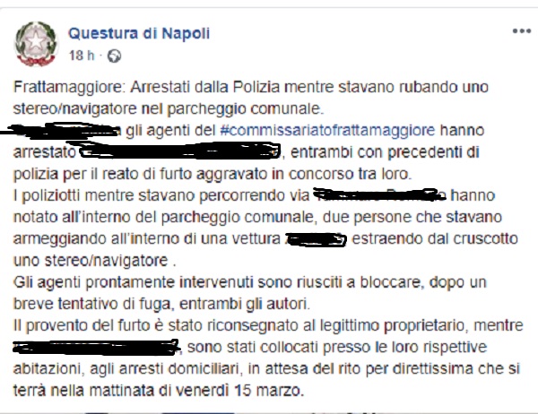 Questo il post pubblicato sulla pagina fb ufficiale della Questura di Napoli