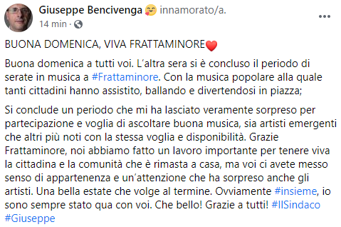 Questo il post pubblicato sulla sua pagina Facebook dal Sindaco di Frattaminore Giuseppe Bencivenga: "BUONA DOMENICA, VIVA FRATTAMINORE. Buona domenica a tutti voi. L’altra sera si è concluso il periodo di serate in musica a Frattaminore. Con la musica popolare alla quale - si legge nel post - tanti cittadini hanno assistito, ballando e divertendosi in piazza; Si conclude un periodo che mi ha lasciato veramente sorpreso per partecipazione e voglia di ascoltare buona musica, sia artisti emergenti che altri più noti con la stessa voglia e disponibilità. Grazie Frattaminore - si legge ancora - noi abbiamo fatto un lavoro importante per tenere viva la cittadina e la comunità che è rimasta a casa, ma voi ci avete messo senso di appartenenza e un’attenzione che ha sorpreso anche gli artisti. Una bella estate che volge al termine. Ovviamente insieme, io sono sempre stato qua con voi. Che bello - conclude il post - Grazie a tutti".