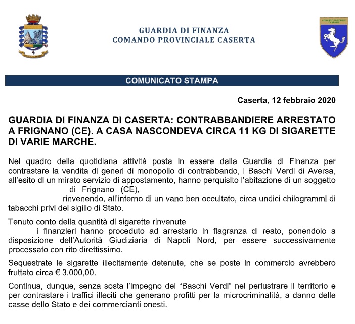 Pubblichiamo nota stampa del Comando Provinciale Guardia di Finanza Caserta