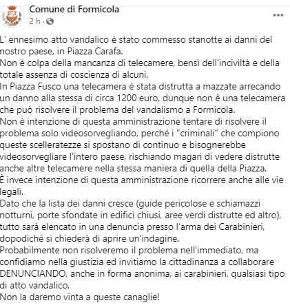 Questo il post pubblicato sulla pagina Facebook 'Comune di Formicola': "L' ennesimo atto vandalico è stato commesso stanotte ai danni del nostro paese, in Piazza Carafa. Non è colpa della mancanza di telecamere, bensì dell'inciviltà e della totale assenza di coscienza di alcuni. In Piazza Fusco - si legge nel post - una telecamera è stata distrutta a mazzate arrecando un danno alla stessa di circa 1200 euro, dunque non è una telecamera che può risolvere il problema del vandalismo a Formicola. Non è intenzione di questa amministrazione tentare di risolvere il problema solo videosorvegliando, perché i "criminali" - prosegue il post - che compiono queste scelleratezze si spostano di continuo e bisognerebbe videosorvegliare l'intero paese, rischiando magari di vedere distrutte anche altre telecamere nella stessa maniera di quella della Piazza. È invece intenzione di questa amministrazione - si legge ancora - ricorrere anche alle vie legali. Dato che la lista dei danni cresce (guide pericolose e schiamazzi notturni, porte sfondate in edifici chiusi, aree verdi distrutte ed altro), tutto sarà elencato in una denuncia presso l'arma dei Carabinieri, dopodiché si chiederà di aprire un'indagine. Probabilmente - si legge nel post - non risolveremo il problema nell'immediato, ma confidiamo nella giustizia ed invitiamo la cittadinanza a collaborare DENUNCIANDO, anche in forma anonima, ai carabinieri, qualsiasi tipo di atto vandalico. Non la daremo vinta a queste canaglie!".
