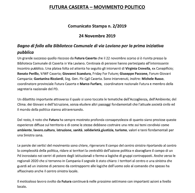 Di seguito, il testo del comunicato di 'Futura Caserta', giunto in redazione: