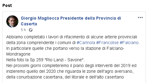 Lo apprendiamo dalla pagina Facebook di Giorgio Magliocca, Presidente della Provincia di Caserta: