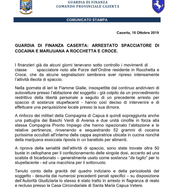 GDF CASERTA: "ARRESTATO SPACCIATORE DI COCAINA E MARIJUANA A ROCCHETTA E CROCE"