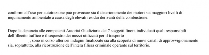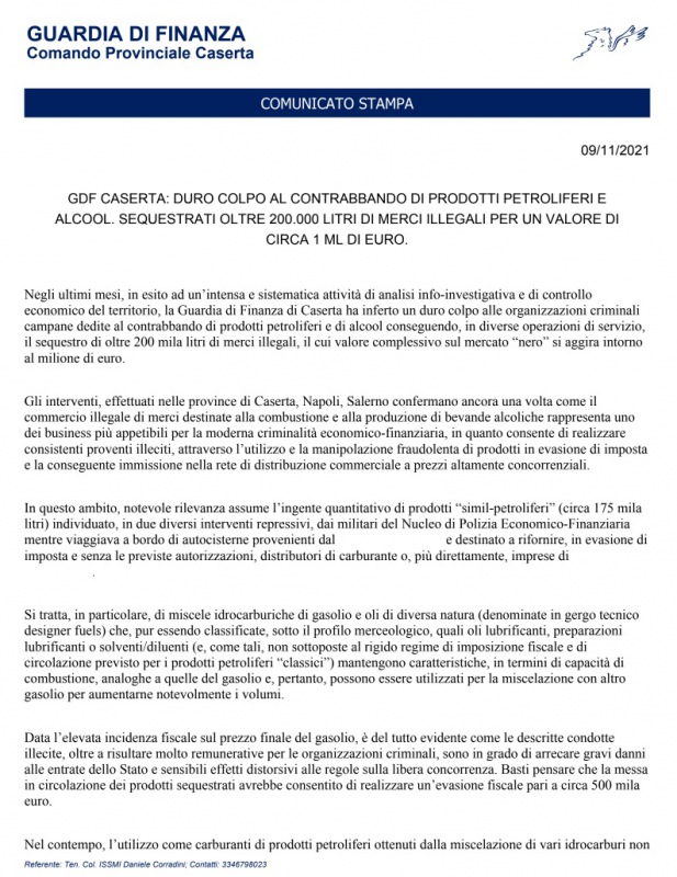 "Negli ultimi mesi, in esito ad un’intensa e sistematica attività di analisi info-investigativa e di controllo economico del territorio, la Guardia di Finanza di Caserta ha inferto un duro colpo alle organizzazioni criminali campane dedite al contrabbando di prodotti petroliferi e di alcool conseguendo, in diverse operazioni di servizio, il sequestro di oltre 200 mila litri di merci illegali, il cui valore complessivo sul mercato “nero” si aggira intorno al milione di euro. Gli interventi, effettuati nelle province di Caserta, Napoli, Salerno confermano ancora una volta come il commercio illegale di merci destinate alla combustione e alla produzione di bevande alcoliche rappresenta uno dei business più appetibili per la moderna criminalità economico-finanziaria, in quanto consente di realizzare consistenti proventi illeciti, attraverso l’utilizzo e la manipolazione fraudolenta di prodotti in evasione di imposta e la conseguente immissione nella rete di distribuzione commerciale a prezzi altamente concorrenziali. -Si legge nella nota- In questo ambito, notevole rilevanza assume l’ingente quantitativo di prodotti “simil-petroliferi” (circa 175 mila litri) individuato, in due diversi interventi repressivi, dai militari del Nucleo di Polizia Economico-Finanziaria mentre viaggiava a bordo di autocisterne provenienti dal ... e destinato a rifornire, in evasione di imposta e senza le previste autorizzazioni, distributori di carburante o, più direttamente, imprese di ... Si tratta, in particolare, di miscele idrocarburiche di gasolio e oli di diversa natura (denominate in gergo tecnico designer fuels) che, pur essendo classificate, sotto il profilo merceologico, quali oli lubrificanti, preparazioni lubrificanti o solventi/diluenti (e, come tali, non sottoposte al rigido regime di imposizione fiscale e di circolazione previsto per i prodotti petroliferi “classici”) mantengono caratteristiche, in termini di capacità di combustione, analoghe a quelle del gasolio e, pertanto, possono essere utilizzati per la miscelazione con altro gasolio per aumentarne notevolmente i volumi. Data l’elevata incidenza fiscale sul prezzo finale del gasolio, è del tutto evidente come le descritte condotte illecite, oltre a risultare molto remunerative per le organizzazioni criminali, sono in grado di arrecare gravi danni alle entrate dello Stato e sensibili effetti distorsivi alle regole sulla libera concorrenza. -Si legge nella nota- Basti pensare che la messa in circolazione dei prodotti sequestrati avrebbe consentito di realizzare un’evasione fiscale pari a circa 500 mila euro. Nel contempo, l’utilizzo come carburanti di prodotti petroliferi ottenuti dalla miscelazione di vari idrocarburi non conformi all’uso per autotrazione può provocare sia il deterioramento dei motori sia maggiori livelli di inquinamento ambientale a causa degli elevati residui derivanti della combustione. Dopo la denuncia alle competenti Autorità Giudiziaria dei 7 soggetti finora individuati quali responsabili dell’illecito traffico e il sequestro dei mezzi utilizzati per il trasporto ... , sono in corso ulteriori indagini finalizzate sia alla scoperta di nuovi canali di approvvigionamento sia, soprattutto, alla ricostruzione dell’intera filiera criminale operante sul territorio."