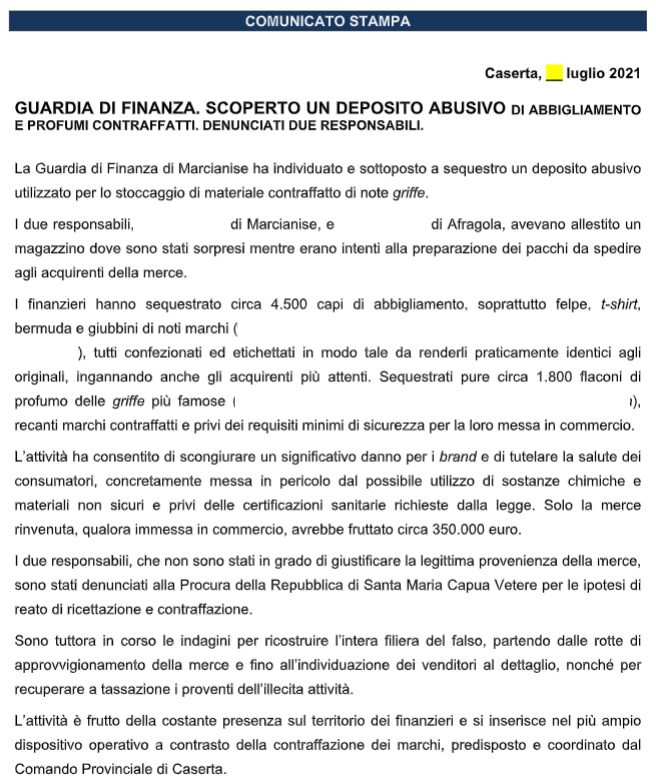 Pubblichiamo nota stampa Comando Provinciale Guardia di Finanza Caserta: "GUARDIA DI FINANZA. SCOPERTO UN DEPOSITO ABUSIVO DI ABBIGLIAMENTO E PROFUMI CONTRAFFATTI. DENUNCIATI DUE RESPONSABILI.