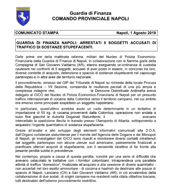 Di seguito, parte del testo del comunicato della Guardia di Finanza, giunto in redazione.