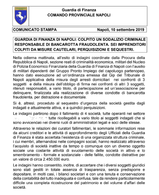 Di seguito, parte del testo del comunicato della Guardia di Finanza, giunto in redazione.