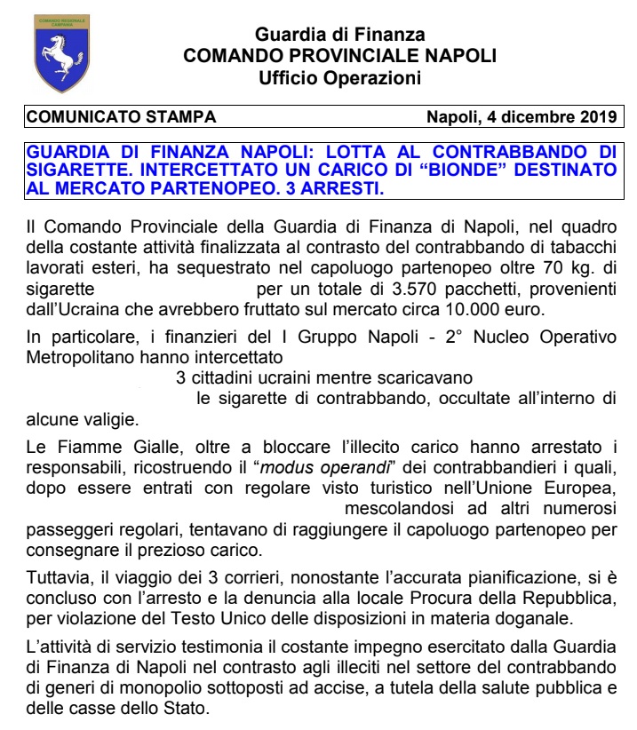 Pubblichiamo nota stampa del Comando Provinciale GDF Napoli