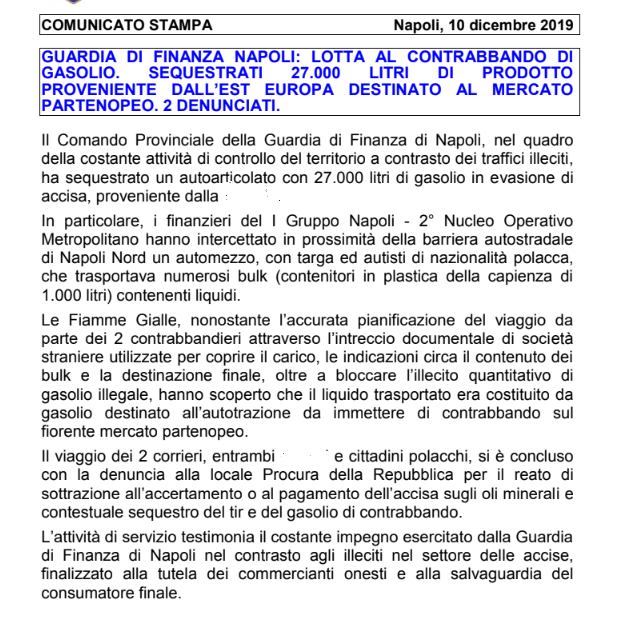 Di seguito, parte del testo del comunicato della Guardia di Finanza, giunto in redazione.