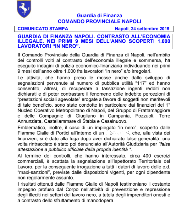 Di seguito, parte del testo del comunicato della Guardia di Finanza, giunto in redazione.