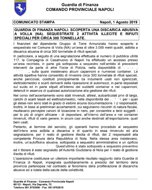 Di seguito, parte del testo del comunicato della Guardia di Finanza, gunto in redazione.