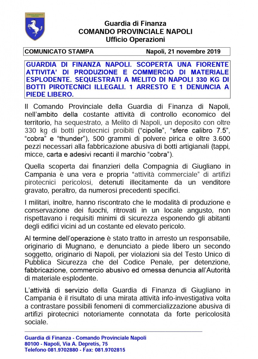 "GDF NAPOLI: SEQUESTRATI A MELITO DI NAPOLI 330 KG DI FUOCHI PIROTECNICI ILLEGALI. 1 ARRESTATO ED 1 DENUNCIATO"