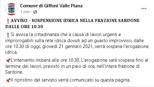 "%uD835%uDC00%uD835%uDC15%uD835%uDC15%uD835%uDC08%uD835%uDC12%uD835%uDC0E - %uD835%uDC12%uD835%uDC0E%uD835%uDC12%uD835%uDC0F%uD835%uDC04%uD835%uDC0D%uD835%uDC12%uD835%uDC08%uD835%uDC0E%uD835%uDC0D%uD835%uDC04 %uD835%uDC08%uD835%uDC03%uD835%uDC11%uD835%uDC08%uD835%uDC02%uD835%uDC00 %uD835%uDC0D%uD835%uDC04%uD835%uDC0B%uD835%uDC0B%uD835%uDC00 %uD835%uDC05%uD835%uDC11%uD835%uDC00%uD835%uDC19%uD835%uDC08%uD835%uDC0E%uD835%uDC0D%uD835%uDC04 %uD835%uDC12%uD835%uDC00%uD835%uDC11%uD835%uDC03%uD835%uDC0E%uD835%uDC0D%uD835%uDC04 %uD835%uDC03%uD835%uDC00%uD835%uDC0B%uD835%uDC0B%uD835%uDC04 %uD835%uDC0E%uD835%uDC11%uD835%uDC04 %uD835%uDFCF%uD835%uDFCE.%uD835%uDFD1%uD835%uDFCE. Si avvisa la cittadinanza che a causa di lavori urgenti e improrogabili sulla rete idrica dovuti ad un guasto improvviso, dalle ore 10.30 di oggi, giovedì 21 gennaio 2021, verrà sospesa l’erogazione idrica. L'intervento inizierà alle ore 10.30. L'erogazione sarà sospesa fino al termine dei lavori, previsto in un paio di ore, nell'intera frazione di Sardone. Il ripristino del servizio verrà comunicato su questa pagina."
