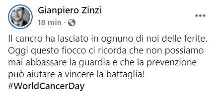 Questo quanto pubblicato sulla pagina fb del Cons. Reg. Zinzi: "Il cancro ha lasciato in ognuno di noi delle ferite - si legge nella nota -. Oggi questo fiocco ci ricorda che non possiamo mai abbassare la guardia e che la prevenzione può aiutare a vincere la battaglia! World Cancer Day"