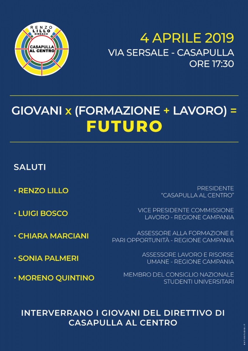 "'Giovani x (Formazione + Lavoro) = Futuro': è questo il titolo del convegno organizzato da 'Casapulla al Centro'. L'incontro si terrà giovedì 4 aprile alle ore 17,30 presso i locali di via Sersale. Interverranno Renzo Lillo, presidente e candidato alla carica di sindaco di 'Casapulla al Centro', -si legge nella nota-il consigliere regionale e vicepresidente della commissione Lavoro Luigi Bosco, l'assessore alla Formazione e alle Pari opportunità della Regione Campania Chiara Marciani, l'assessore regionale al Lavoro e Risorse umane Sonia Palmeri, il membro del Consiglio Nazionale Studenti Universitari Moreno Quintino. Sarà previsto anche l'intervento dei giovani del direttivo di 'Casapulla al Centro'."