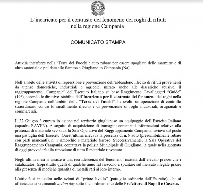 Questa la nota stampa dell'incaricato per il contrasto del fenomeno dei roghi di rifiuti nella regione Campania: