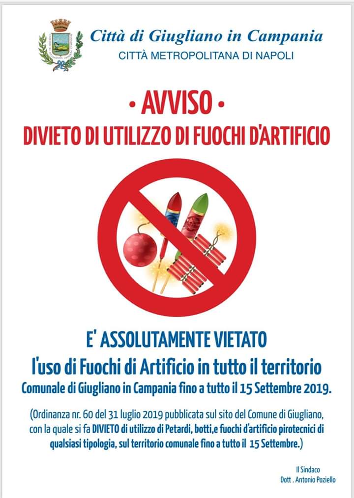 Il Comune di Giugliano in Campania ha emanato un'ordinanza che vieta l'utilizzo di fuochi d'artificio di qualsiasi tipologia, di petardi e di botti in tutto il territorio comunale fino al 15 settembre 2019 compreso.