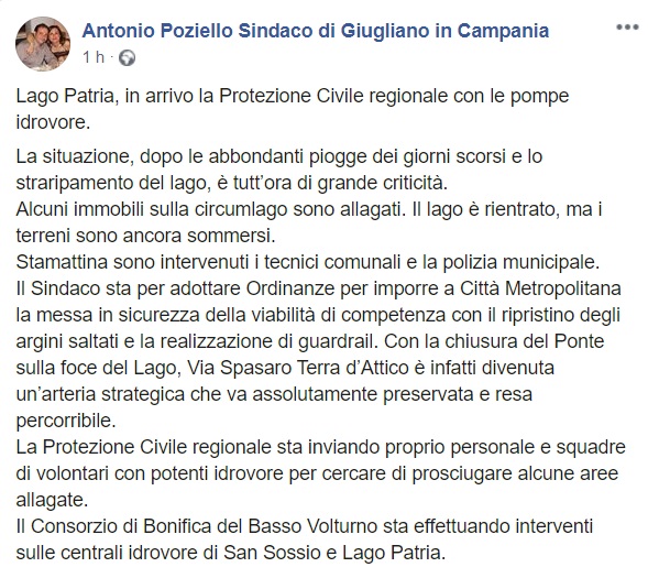 Questo quanto pubblicato sulla pagina facebook del Sindaco Pozziello: