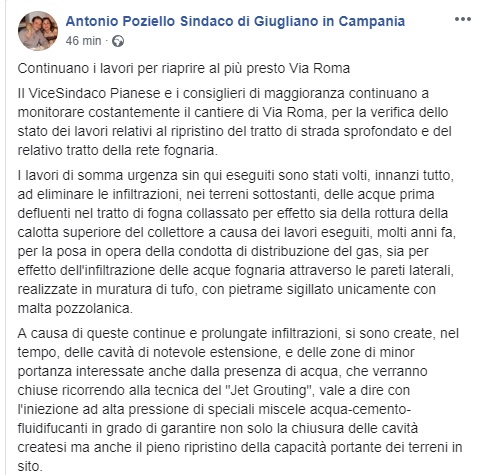 Questo il post pubblicato sulla pagina fb ufficiale del Sindaco di Giugliano Antonio Poziello.