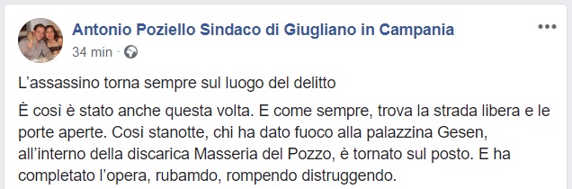 Questo lo sfogo del Sindaco di Giugliano Antonio Poziello in merito all'ennesimo gesto vandalico accaduto in città