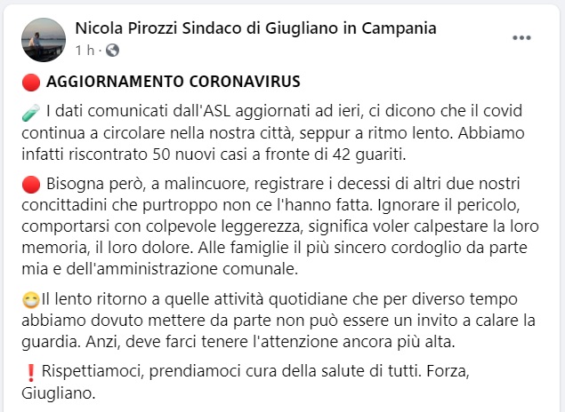 Questo quanto pubblicato e così apprendiamo dalla pagina facebook del Sindaco di Giugliano: "I dati comunicati dall'ASL aggiornati ad ieri, ci dicono che il covid continua a circolare nella nostra città, seppur a ritmo lento. Abbiamo - si legge nella nota - infatti riscontrato 50 nuovi casi a fronte di 42 guariti. Bisogna però, a malincuore, registrare i decessi di altri due nostri concittadini che purtroppo non ce l'hanno fatta. Ignorare il pericolo, comportarsi con colpevole leggerezza, significa voler calpestare la loro memoria, il loro dolore. Alle famiglie il più sincero cordoglio da parte mia e dell'amministrazione comunale. Il lento ritorno a quelle attività quotidiane che per diverso tempo abbiamo dovuto mettere da parte non può essere un invito a calare la guardia. Anzi - si legge nella nota -, deve farci tenere l'attenzione ancora più alta. Rispettiamoci, prendiamoci cura della salute di tutti. Forza, Giugliano."
