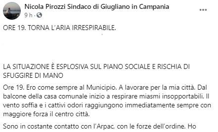 Ore 19. Ero come sempre al Municipio. A lavorare per la mia città. Dal balcone della casa comunale inizio a respirare miasmi insopportabili. Il vento - si legge nel post - soffia e i cattivi odori raggiungono immediatamente sempre con maggiore forza il centro città. Sono in costante contatto con l’Arpac (...)".