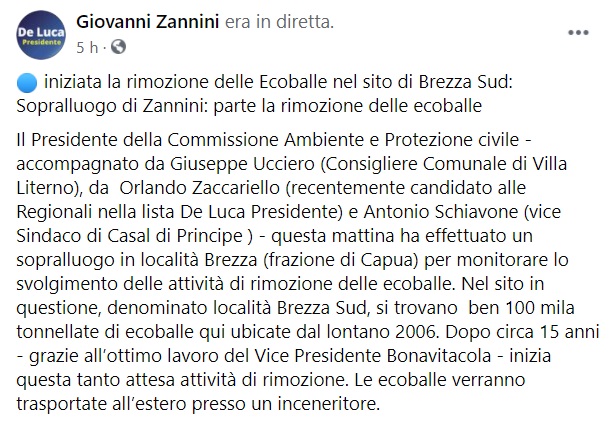 Questo quanto apprendiamo dalla pagina facebook del Cons. Reg. Zannini: