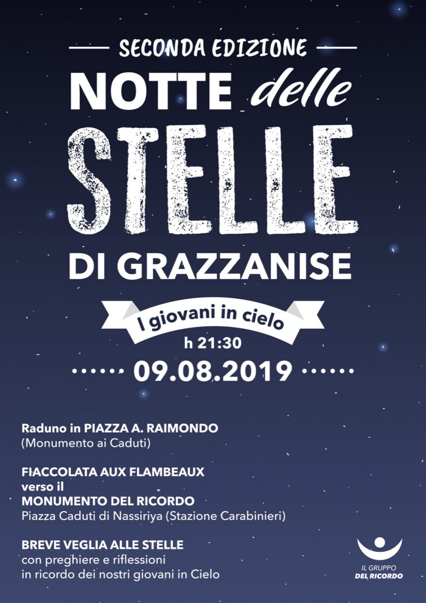 "GRAZZANISE (Raffaele Raimondo) – Torna al buio delle 21,30 di oggi, in seconda edizione, la “Notte delle Stelle di Grazzanise – I giovani in cielo”: un evento che, sì, precede la magica Notte di San Lorenzo, cara a tutti per l’affascinante fenomeno astronomico delle stelle cadenti, assumendo però un valore poco connesso all’effimero dilagante e - si legge nel comunicato - legato invece ad una liturgia di grande valore umano proiettata alla sincera celebrazione del ricordo, sempre struggente, di tutti i giovani grazzanisani che prematuramente hanno perso la vita, perlopiù in tragiche circostanze. Fu del giovane teologo Tiziano Izzo, 7 anni fa, l’idea nobile di erigere il Monumento del Ricordo che nell’ora dei vespri del 13 maggio 2012 venne benedetto dai parroci don Giuseppe Lauritano e padre Francesco Monticelli. Si legge nel comunicato. Da allora la bronzea scultura, raffigurante colombi in volo per l’eternità, è costante e toccante meta di culto per genitori, familiari ed amici degli scomparsi, nonché di meditabonde soste processionali e civili cortei. In sostanza, rispetto a certe durezze ed asprezze del vivere locale, quel Monumento attrae e suscita momenti di emozioni e di eloquenti silenzi davanti al mistero della giovani esistenze spezzate. Si legge nel comunicato. Rimpianto, dunque, e riflessione su una fenomenologia della morte considerata innaturale dai più. Eppure – ricordano le parole scolpite nel 2004 su una lapide che l’Amministrazione comunale guidata dal sindaco Enrico Parente pose nella piazza centrale della frazione Brezza, in memoria di Stefano Izzo spentosi tragicamente – “muore giovane colui che al Cielo è caro”. Verso il cielo guardava padre Monticelli al tramonto di quel 13 maggio. Si legge nel comunicato. E verso il cielo guarderanno stasera quanti vorranno prendere parte al mesto pellegrinaggio che prevede il raduno il Piazza Antonio Raimondo (il giovane elicotterista grazzanisano terribilmente perito a Procida il 18 novembre 1995, durante un’operazione di soccorso). Di là avrà inizio, come a Lourdes e a Fatima, la fiaccolata “aux flambeaux” diretta al Monumento del Ricordo che sorge in Largo Nassiriya (il cui nome, da solo, evoca tristemente il sacrificio dei 25 giovani carabinieri e soldati vittime nella città irachena di ripetuti attentati terroristici contro le forze armate italiane impegnate, dal 2003 al 2006, nell’Operazione Antica Babilonia). Si legge nel comunicato. Si svolgerà poi, alla luce delle fiaccole, una “breve veglia alle stelle con preghiere e riflessioni in ricordo dei nostri giovani in Cielo”. E sarà questa la sequenza più commovente, di sicuro densa di nostalgie e di speranze. Dominante, senza dubbio, fra i presenti il pensiero che da Lassù i giovani – chiamati le “stelle di Grazzanise” – ascoltino ogni palpito, felici degli slanci di coloro che li amarono in vita e contenti d’essere nati in un paese che di questo spaccato di dolente umanità può andar certamente fiero e dal quale può perfino ricavare, - si legge nel comunicato - attualmente e per l’avvenire, suggerimenti ed energie nuove per crescere nei difficili ma irrinunciabili campi del rispetto, della solidarietà, della civiltà. A commento dell’iniziativa, il dottore commercialista Luigi Pezzera (che è stato presidente del Forum dei Giovani, referente di Telefono Azzurro e nel Gruppo del Ricordo attivo fin dalla sua costituzione) ha brevemente dichiarato: “Sentiamo nel profondo del cuore il dovere di mantenere vivo il ricordo dei nostri giovani amici prematuramente scomparsi e ci proponiamo di migliorare ancor più l’impianto organizzativo della prossima edizione”."