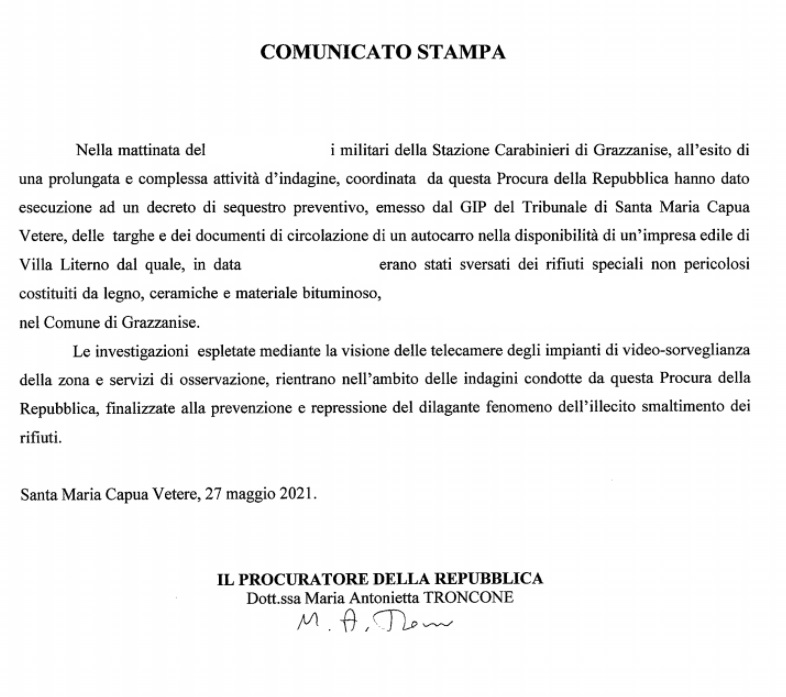 Pubblichiamo nota stampa Procura di SMCV
