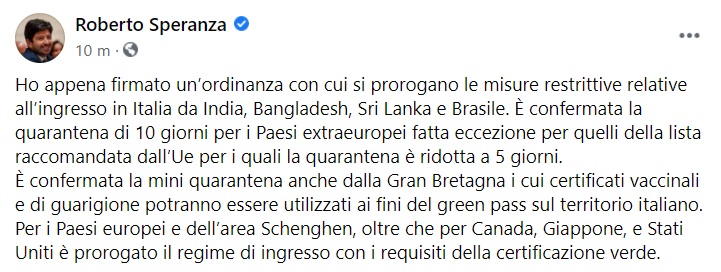 Questo quanto pubblicato sulla pagina fb del Ministro Speranza: "Ho appena firmato un’ordinanza con cui si prorogano le misure restrittive relative all’ingresso in Italia da India, Bangladesh, Sri Lanka e Brasile. È confermata la quarantena di 10 giorni per i Paesi extraeuropei fatta eccezione per quelli della lista raccomandata dall’Ue - si legge nella nota - per i quali la quarantena è ridotta a 5 giorni. È confermata la mini quarantena anche dalla Gran Bretagna i cui certificati vaccinali e di guarigione potranno essere utilizzati ai fini del green pass sul territorio italiano. Per i Paesi europei e dell’area Schenghen, oltre che per Canada, Giappone, e Stati Uniti è prorogato il regime di ingresso con i requisiti della certificazione verde."