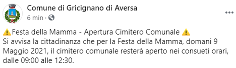 Questo il post pubblicato sulla pagina Facebook 'Comune di Gricignano': "Festa della Mamma - Apertura Cimitero Comunale. Si avvisa la cittadinanza che per la Festa della Mamma - si legge nel post - domani 9 Maggio 2021, il cimitero comunale resterà aperto nei consueti orari, dalle 09:00 alle 12:30".