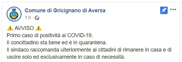Questo quanto comunicato dalla pagina FB del Comune di Gricignano