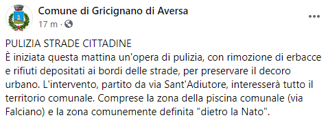 Questo il post pubblicato sulla pagina Facebook 'Comune di Gricignano d'Aversa: "PULIZIA STRADE CITTADINE. È iniziata questa mattina un'opera di pulizia - si legge nel post - con rimozione di erbacce e rifiuti depositati ai bordi delle strade, per preservare il decoro urbano. L'intervento, partito da via Sant'Adiutore, interesserà tutto il territorio comunale. Comprese la zona della piscina comunale (via Falciano) e la zona comunemente definita - conclude il post - "dietro la Nato".