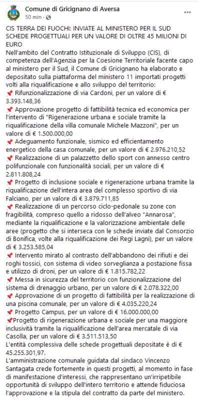 Questo il post pubblicato sulla pagina Facebook del Comune di Gricignano di Aversa: "Nell'ambito del Contratto Istituzionale di Sviluppo (CIS), di competenza dell'Agenzia per la Coesione Territoriale facente capo al ministero per il Sud, il Comune di Gricignano - si legge nel post - ha elaborato e depositato sulla piattaforma del ministero 11 importati progetti volti alla riqualificazione e allo sviluppo del territorio: Rifunzionalizzazione di via Cardoni, per un valore di € 3.393.148,36; Approvazione progetto di fattibilità tecnica ed economica per l'intervento di "Rigenerazione urbana e sociale tramite la riqualificazione della villa comunale Michele Mazzoni", per un valore di € 1.500.000,00; Adeguamento funzionale, sismico ed efficientamento energetico della casa comunale, per un valore di € 2.976.210,52; Realizzazione - recita ancora il post - di un palazzetto dello sport con annesso centro polifunzionale con funzionalità sociali, per un valore di € 2.811.808,24; Progetto di inclusione sociale e rigenerazione urbana tramite la riqualificazione dell'intera area del complesso sportivo di via Falciano, per un valore di € 3.879.711,85; Realizzazione di un percorso ciclo-pedonale su zone con fragibilità, compreso quello a ridosso dell'alveo "Annarosa", mediante la riqualificazione e la valorizzazione ambientale delle aree (progetto che si interseca con le schede inviate dal Consorzio di Bonifica, volte alla riqualificazione dei Regi Lagni), per un valore di € 3.253.585,04; Intervento mirato al contrasto - continua ancora il post - dell'abbandono dei rifiuti e dei roghi tossici, con sistema di video sorveglianza a postazione fissa e utilizzo di droni, per un valore di € 1.815.782,22; Messa in sicurezza del territorio con funzionalizzazione del sistema di drenaggio urbano, per un valore di € 2.078.322,00; Approvazione di un progetto di fattibilità per la realizzazione di una piscina comunale, per un valore di € 4.035.220,24; Progetto Campus, per un valore di € 16.000.000,00;Progetto di rigenerazione urbana e sociale per una maggiore inclusività tramite la riqualificazione dell'area mercatale di via Casolla, per un valore di € 3.511.513,50. L'entità complessiva - specifica - delle schede progettuali depositate è di € 45.255.301,97. L'amministrazione comunale guidata dal sindaco Vincenzo Santagata crede fortemente in questi progetti, al momento in fase di manifestazione d'interessi, che rappresentano un'irripetibile opportunità di sviluppo dell'intero territorio e attende fiduciosa l'approvazione e la stipula del contratto da parte del ministero -conclude il post".
