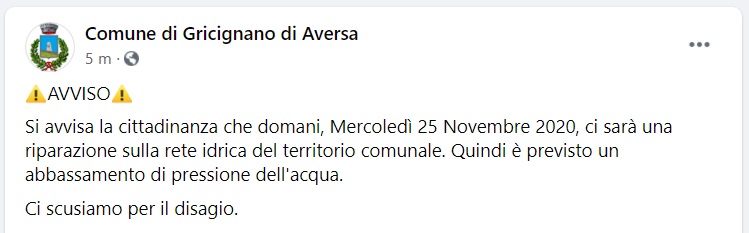 Questo quanto pubblicato sul profilo fb del Comune di Gricignano