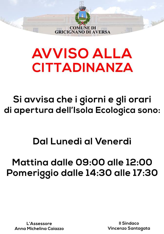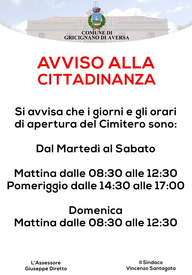 Questi gli orari di apertura del cimitero e dell'isola ecologica di Gricignano d'Aversa pubblicatI sulla pagina Facebook "SiAmo Gricignano":