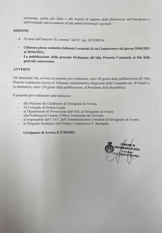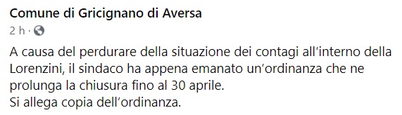 Questo quanto apprendiamo dalla pagina fb del Comune di Gricignano: "A causa del perdurare della situazione dei contagi all’interno della Lorenzini, il sindaco ha appena emanato - si legge nella nota - un’ordinanza che ne prolunga la chiusura fino al 30 aprile. Si allega copia dell’ordinanza."