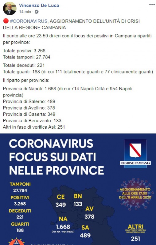 H. 17:30. Coronavirus in Campania 8/4. Napoli a 1.668 contagi, segue Salerno a 489. A Caserta 349