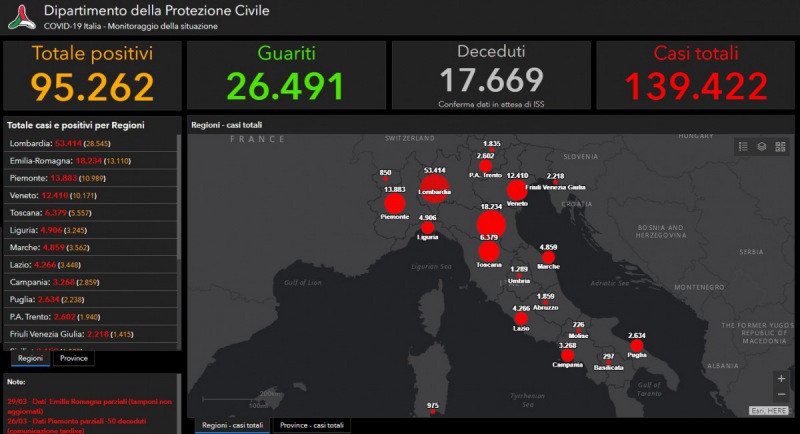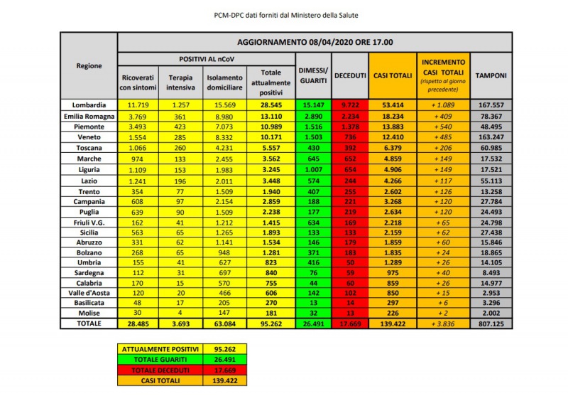 Questi i dati emanati dalla Prot. Civile in merito ai contagi da Coronavirus. Totale positivi 95.262, che fanno salire a 139.422 i casi totali. I guariti sono 26.491 mentre i deceduti sono 17.669 (Conferma dati in attesa di I.S.S.).