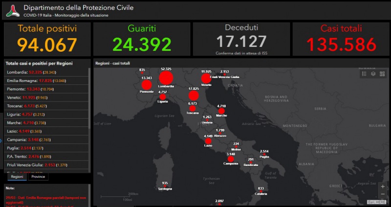 Questi i dati emanati dalla Prot. Civile in merito ai contagi da Coronavirus. Totale positivi 94.067, che fanno salire a 135.586 i casi totali. I guariti sono 24.392 mentre i deceduti sono 17.127 (Conferma dati in attesa di I.S.S.)