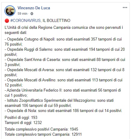 Questo quanto comunicato dal Pres. De Luca