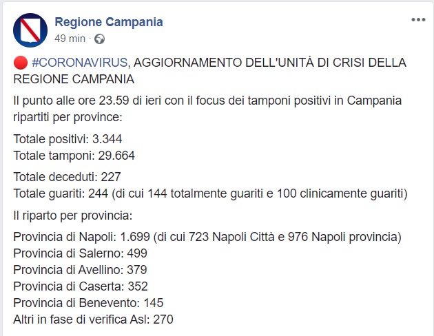Questo quanto comunicato dalla Regione Campania