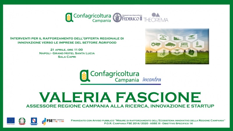 Il 21 aprile Confagricoltura Campania, Università Federico II e Theorema illustrano il progetto "Interventi per il rafforzamento dell’offerta regionale di Innovazione verso le imprese del settore Agrifood". Giovedì 21 aprile, ore 11:00, presso la Sala Capri del Grand Hotel Santa Lucia, in via Partenope n.46, a Napoli, Confagricoltura Campania - si legge nel comunicato - l’Università degli Studi di Napoli Federico II e Theorema presenteranno all’Assessore alla Ricerca, Innovazione e Startup della Regione Campania, Valeria Fascione, il progetto "Interventi per il rafforzamento dell’offerta regionale di Innovazione verso le imprese del settore Agrifood". Il progetto, finanziato con Avviso pubblico “Misure di rafforzamento dell'Ecosistema innovativo della Regione Campania” POR Campania FSE 2014/2020 - Asse III – Obiettivo Specifico 14, della durata di un anno - prosegue il comunicato - darà avvio al primo Incubatore Agrifood regionale a supporto dell’innovazione delle filiere agroalimentari. In un’ottica di open innovation e con un approccio di tipo “buttom-up”, focalizzando quindi l’attenzione sugli specifici bisogni delle singole aziende della filiera agroalimentare regionale, del mondo della ricerca e dei soggetti per la creazione di impresa, i tre partner di progetto, Confagricoltura Campania, Università Federico II e Theorema, sperimenteranno le prime forme di collaborazione per creare poi un hub regionale per l’innovazione agroalimentare. Introduce: Dott. Fabrizio Marzano - Presidente Confagricoltura Campania e Napoli, Interventi: Dott. Aldo Guida – CEO Theorema Prof. Carlo Altucci - Dipartimento di Scienze biomediche avanzate dell'Università Federico II Dott.ssa Lucia Rinaldi - Presidente Confagricoltura Donna Campania, Conclusioni: Prof. Danilo Ercolini - Direttore Dipartimento di Agraria dell'Università di Napoli Federico II Dott.ssa Valeria Fascione - Assessore Regione Campania alla Ricerca, Innovazione e Startup Presenti al tavolo di lavoro: Dott. Rosario Rago - Membro di giunta Confederazione Generale dell'Agricoltura Italiana Dott. Giuseppe Morano - Vice Presidente Giovani Confagricoltura Campania Dott. Angelo Frattolillo - Presidente Confagricoltura Avellino Dott. Antonio Casazza - Presidente Confagricoltura Benevento Ing. Raffaele Puoti - Presidente Confagricoltura Caserta Dott. Antonio Costantino - Presidente Confagricoltura Salerno Dott. Paolo Di Palma - Direttore Confagricoltura Campania Dott. Antonio Caputo - Direttore Confagricoltura Avellino Dott. Antonio Giannini - Direttore Confagricoltura Benevento Dott. Tommaso Picone - Direttore - recita ancora il comunicato -Confagricoltura Caserta Dott. Francesco Fiore - Direttore Confagricoltura Napoli Dott. Carmine Libretto - Direttore Confagricoltura Salerno Dott. Vincenzo Filetti - Theorema".